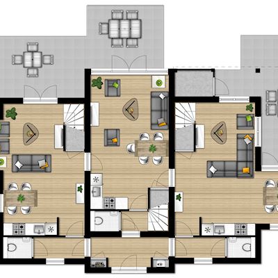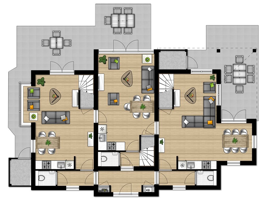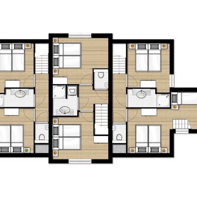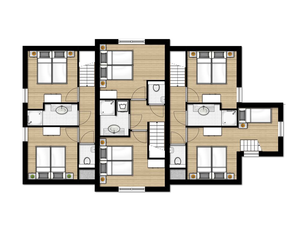 - Three bathrooms with shower cubicle and washbasin on the first floor