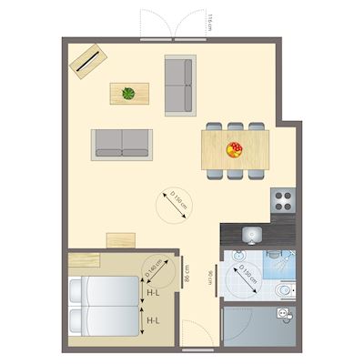 - Adapted bathroom with walk-in shower, shower seat with armrest, raised toilet with grab rails and washbasin a minimum of 78 cm high, wheelchair friendly and turning circle a minimum of 150 cm