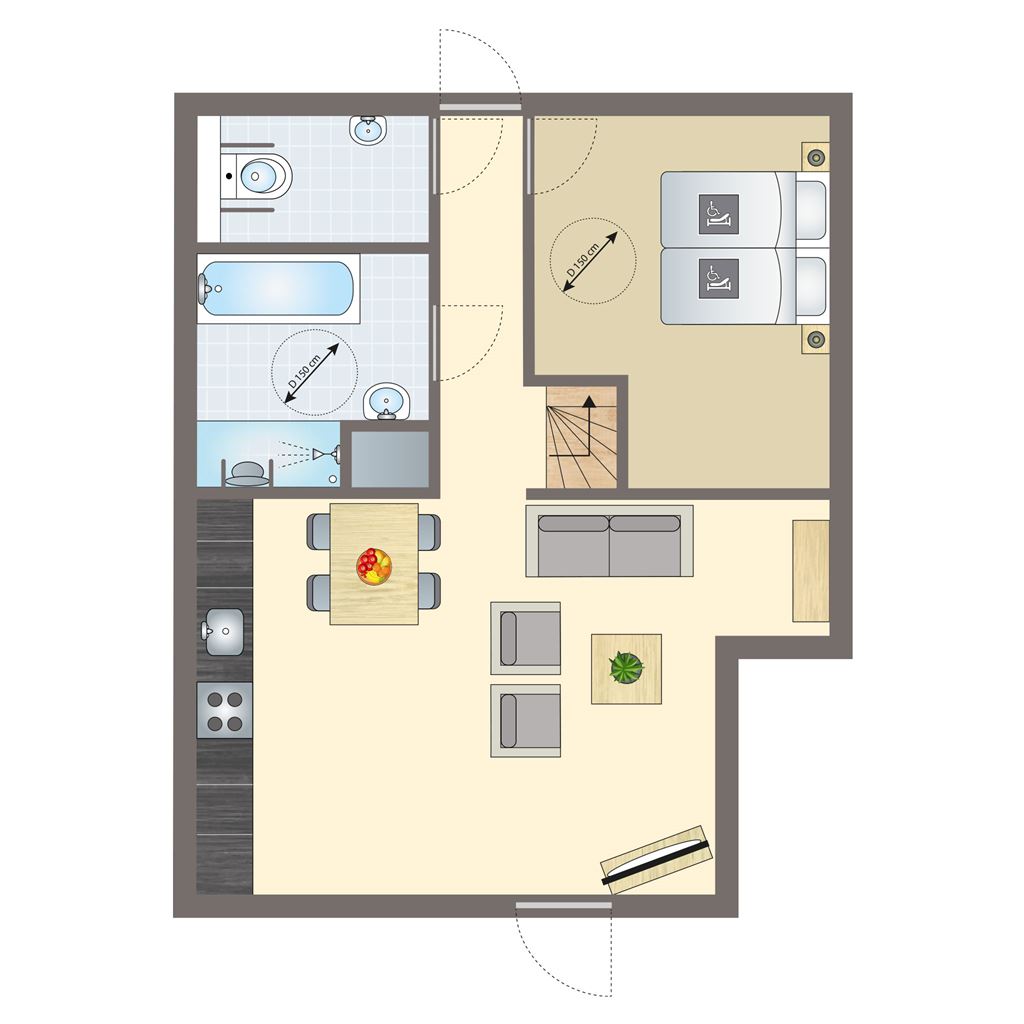 - Adapted bathroom with walk-in shower, shower seat, grab rails in showe, single lever mixer tapes, washbasin a minimum of 78 cm high and wheelchair-friendly, adjustable mirror or full-length mirror and a turning circle a minimum of 150 cm