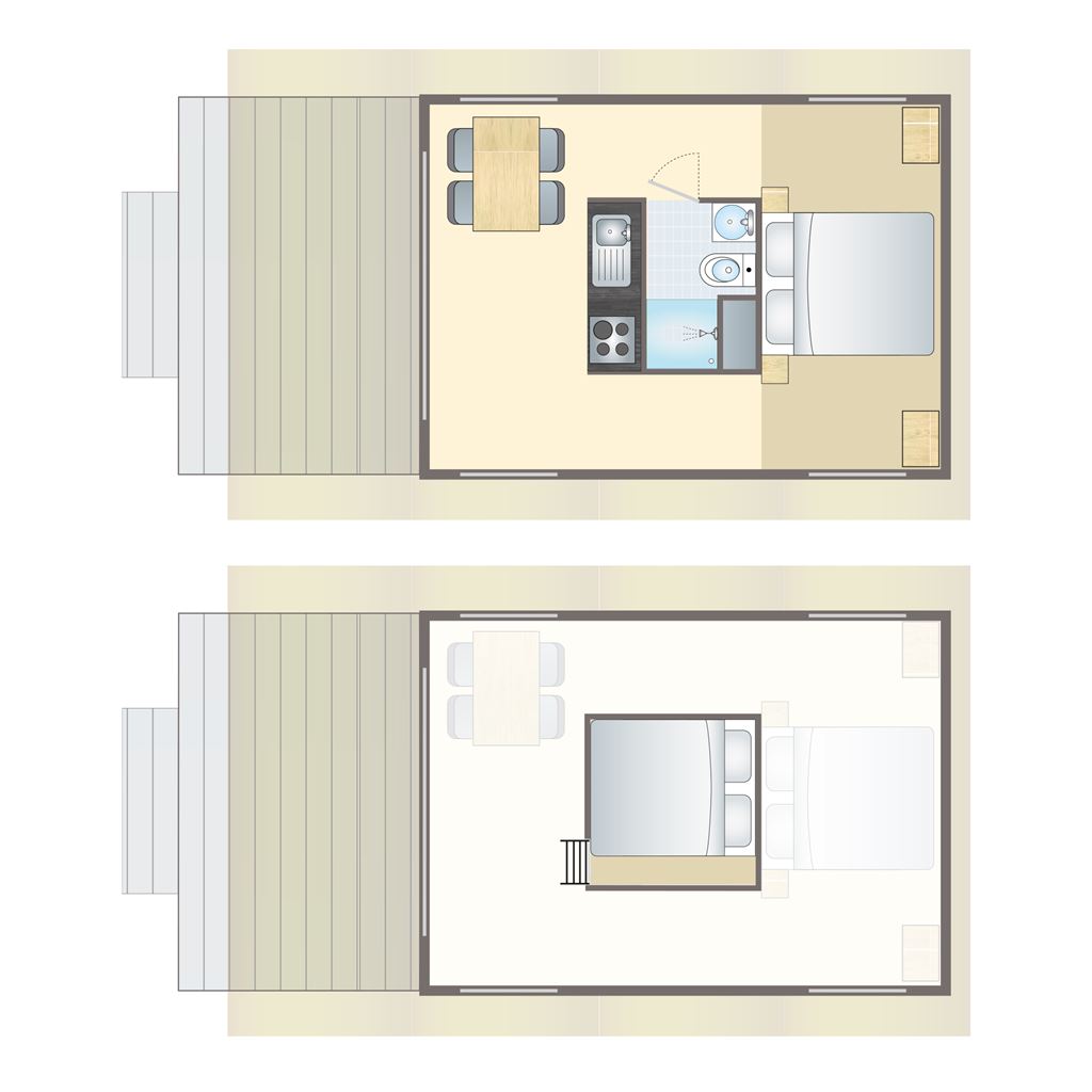 - Two floors (small sleeping loft accessible via stairs)