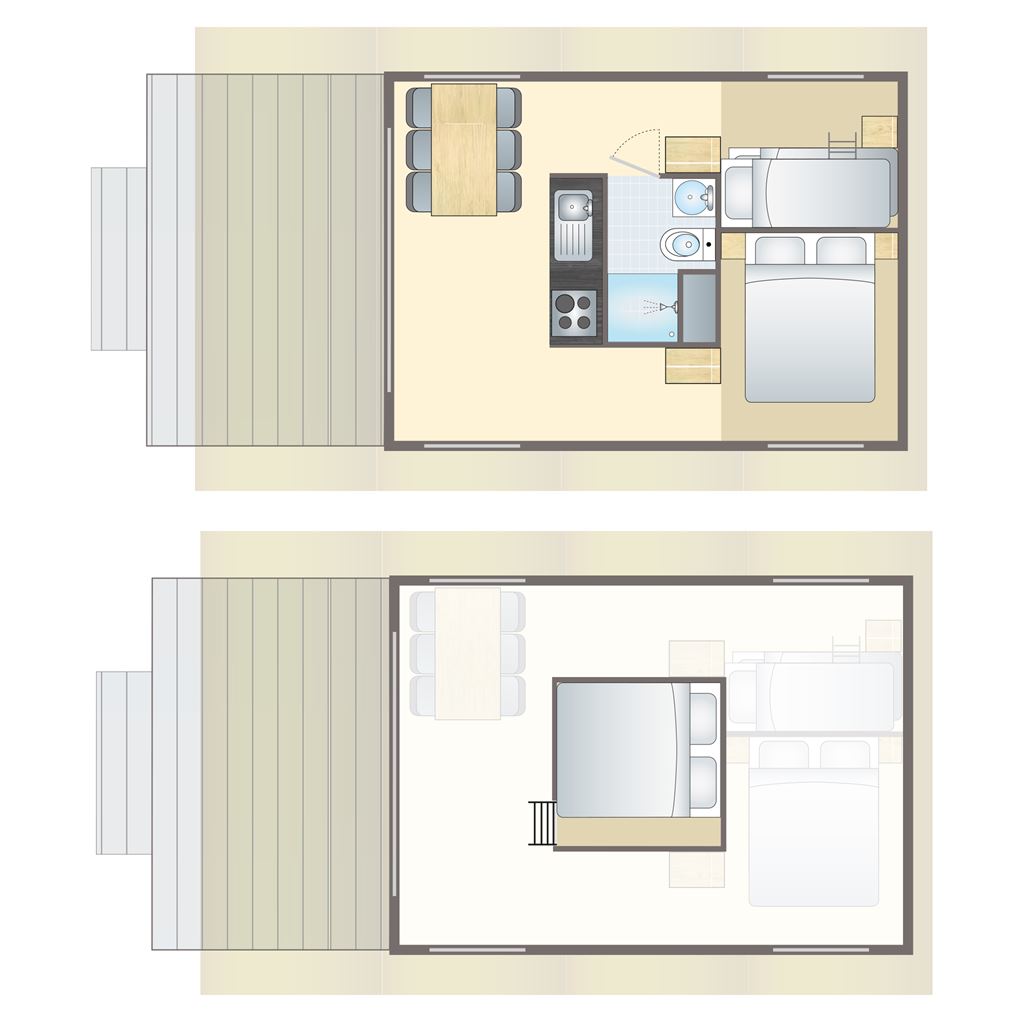 - Two floors (small sleeping loft accessible via stairs)