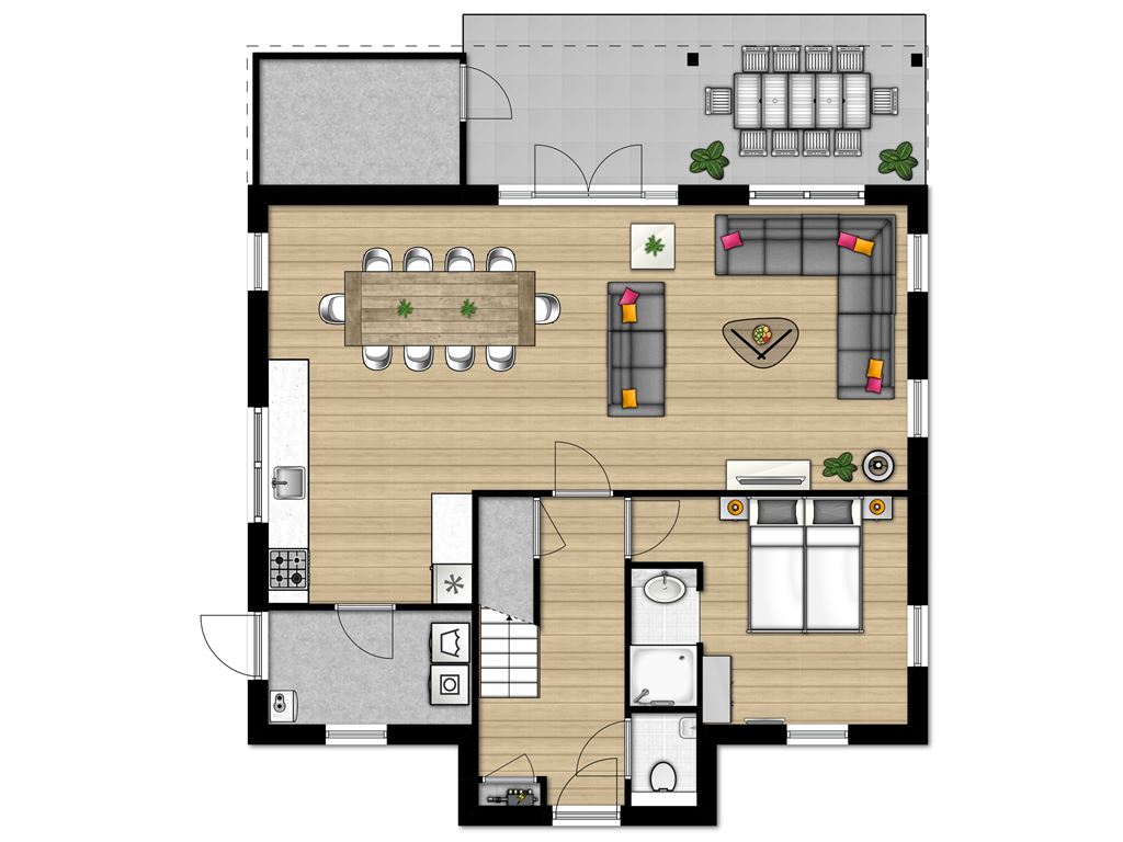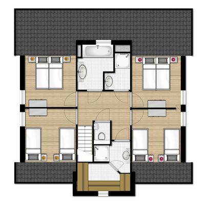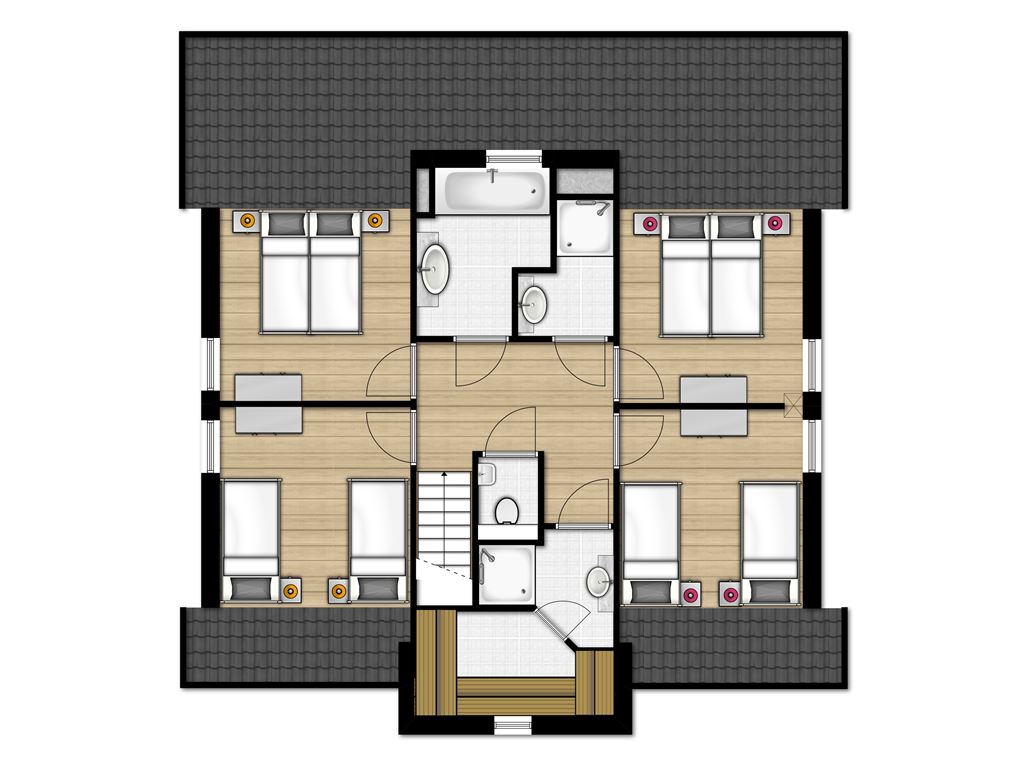 - Two bathrooms with shower cubicle and washbasin on the first floor