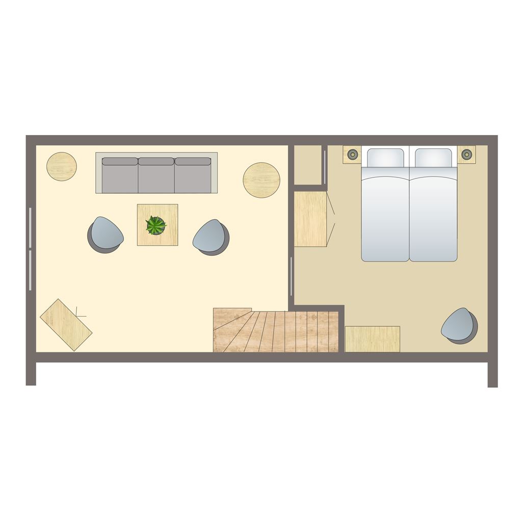 Holiday home on 2 levels with access from the kitchen to a private terrace. There are 2 bedrooms (1 on the ground floor and 1 on the 1st floor) with 2 beds each, and a living room with a sofa bed for 2 people. The holiday homes are privately owned, therefore descriptions, photos, specifications and floor plans of the holiday homes are indicative and may vary.