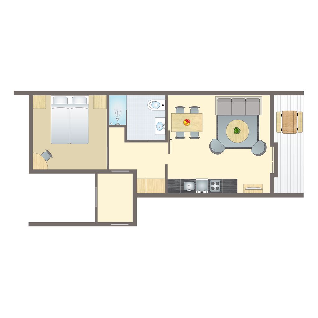 The holiday home is on one level with a combined kitchen, dining area and living room with access to a private terrace with garden furniture. There is 1 bedroom with 2 beds and a sofa bed in the living room with space for 2 children. The holiday homes are privately owned, therefore descriptions, photos, specifications and floor plans of the holiday homes are indicative and may vary.