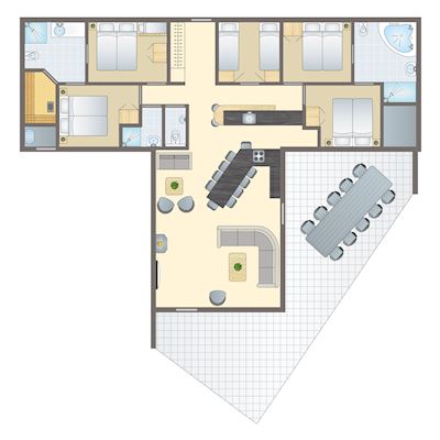 - Three bedrooms with a 2-person bed and flatscreen TV