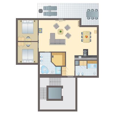 - Bathroom with double rain shower and steam shower, double washbasin and toilet
