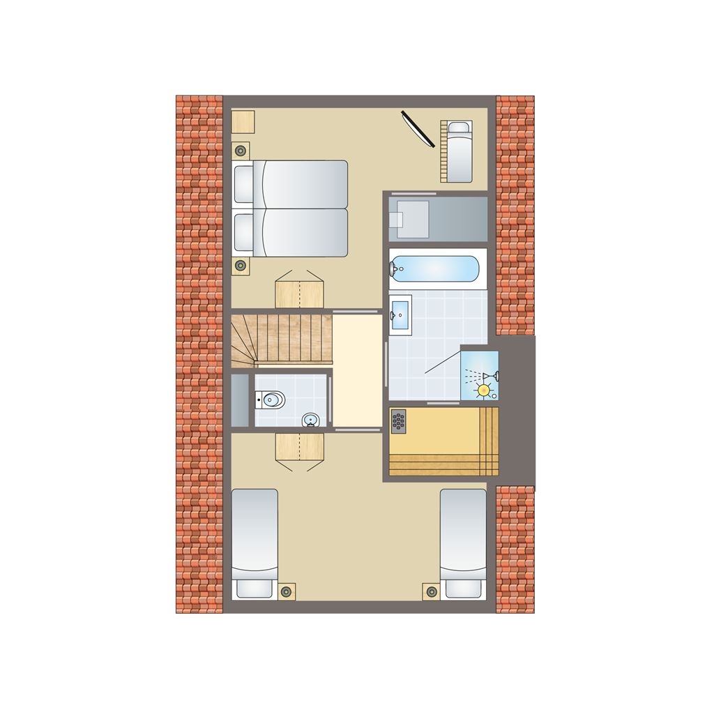 - Bathroom with sun shower, bathtub and washbasin on the first floor